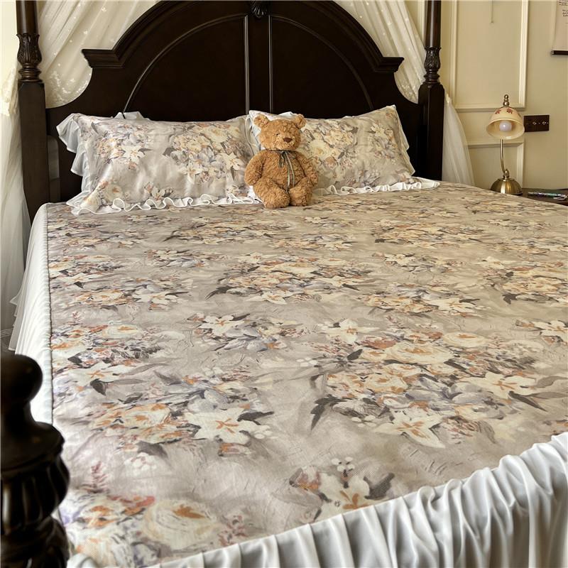 夏季法式床裙款冰丝席三件套田园风花卉可机洗凉感空调席折叠凉席