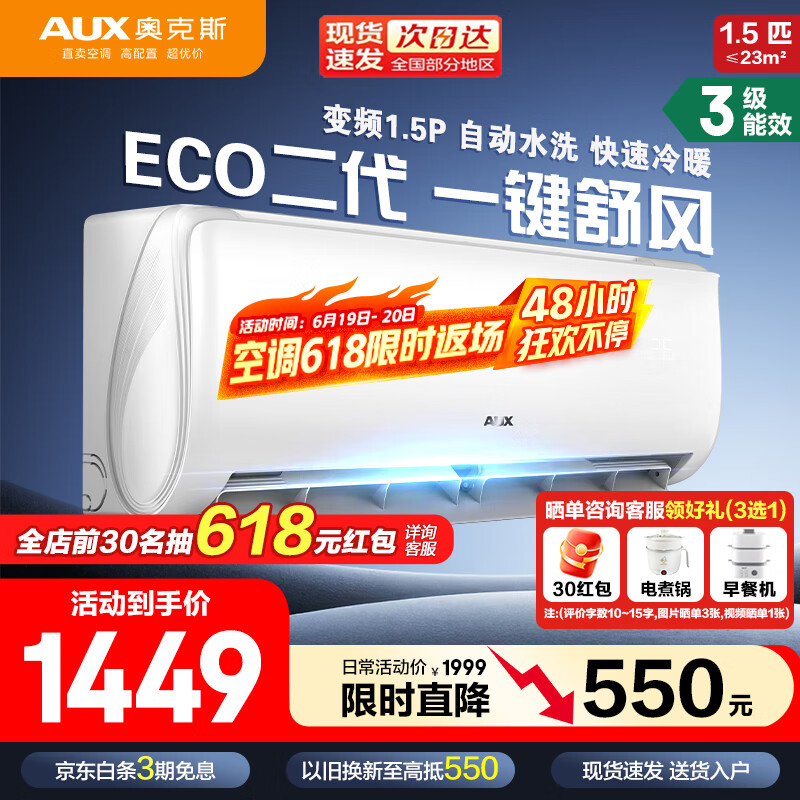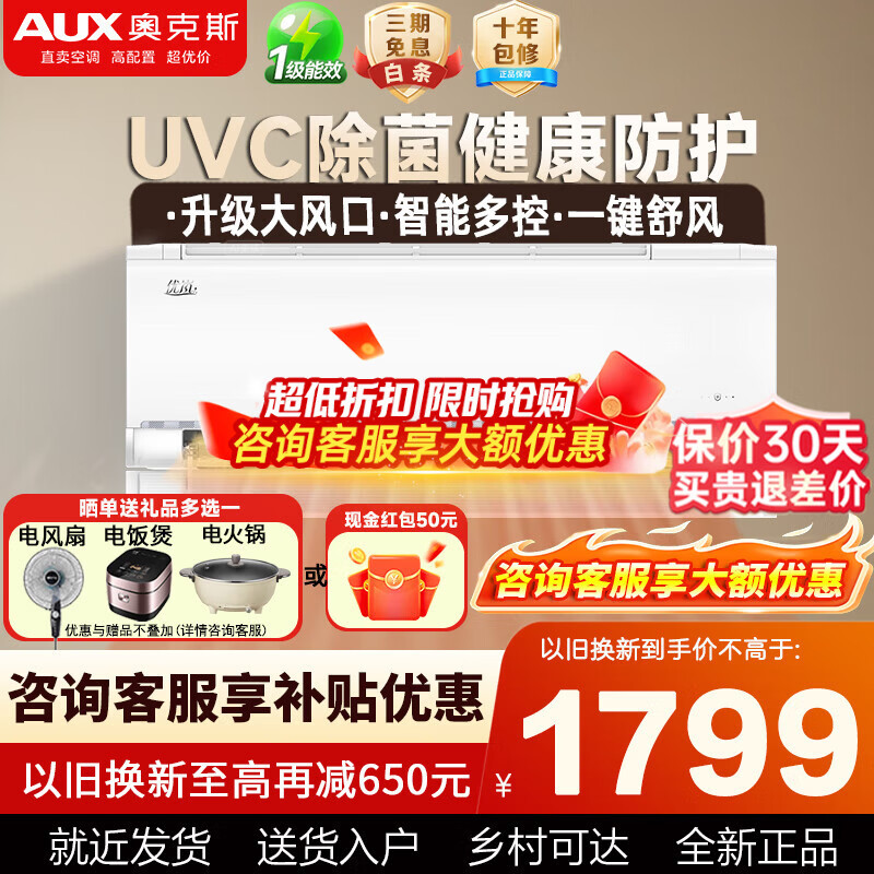 奥克斯(AUX)大1.5匹空调挂机 新一级能效变频冷暖壁挂式空调UVC除菌 大风口WiFi智控空调以旧换新 大1.5匹一级能效深度除菌适用15-22㎡