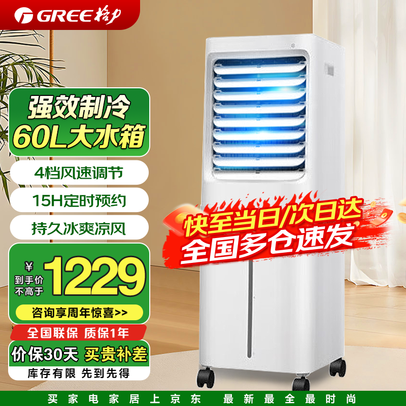 格力(GREE)空调扇冷风扇家用卧室别墅水冷风机节能遥控办公移动工业加湿单冷风扇电扇商家两用冷风机 白色KS-60X60DagL(60升大水箱)