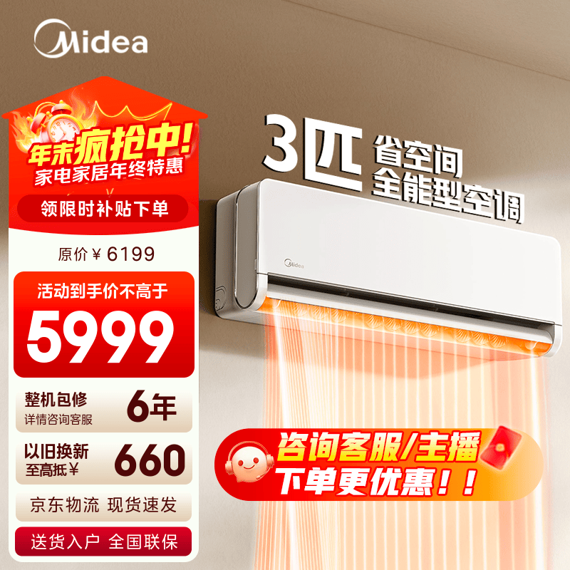 美的空调 风尊二代 超一级能效变频冷暖 智能舒适省电 家用空调挂机 以旧换新 家电国家补贴20% 全面风 3匹 适用面积≤43㎡