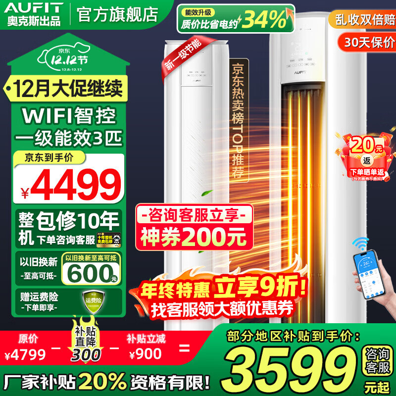 AUFIT空调奥克斯(AUX)出品 大3匹新一级变频冷暖立柜式空调2匹 家电补贴20%智控大风量省电自清洁空调 大3匹 一级能效 省电SE防直吹除湿自清洁