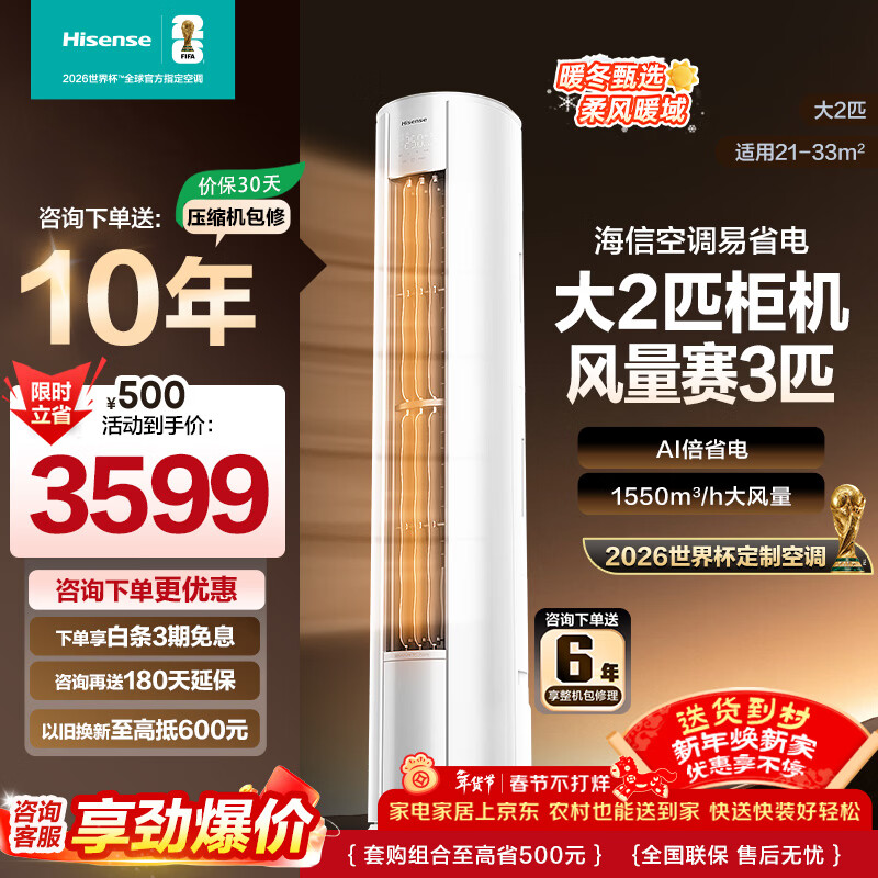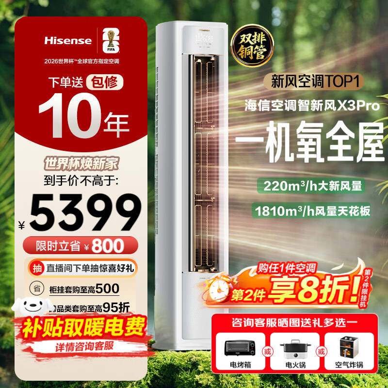 海信(Hisense)新风空调X3Pro 大3匹 【咨询享优惠】增氧新风超大新风量AI省电新一能效节能变频冷暖智控立式空调 大2匹 一级能效50E280 十年压机包修