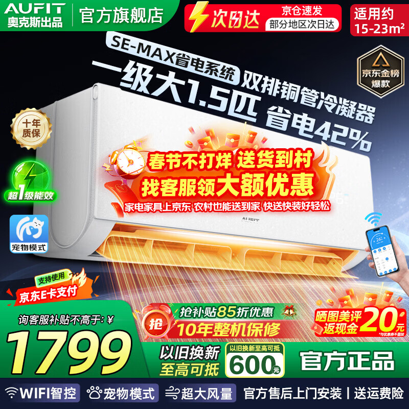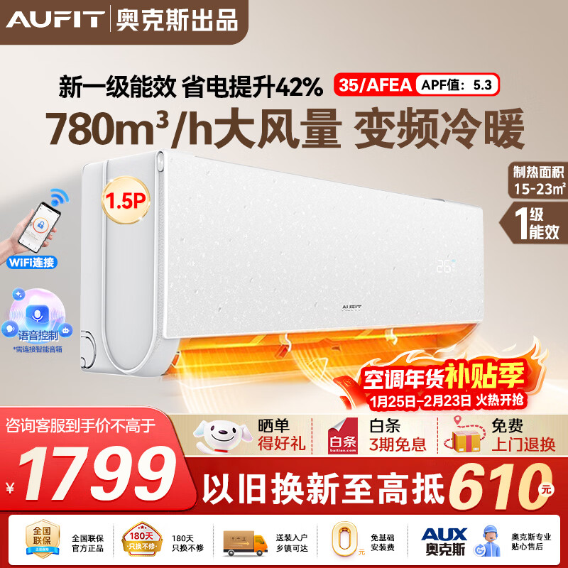 AUFIT空调奥克斯出品 大1.5匹2匹3匹P 新一级能效 变频冷暖节能省电WiFi智控家用空调挂机 超省电 大1匹 一级能效-带WiFi冷暖【壁挂】