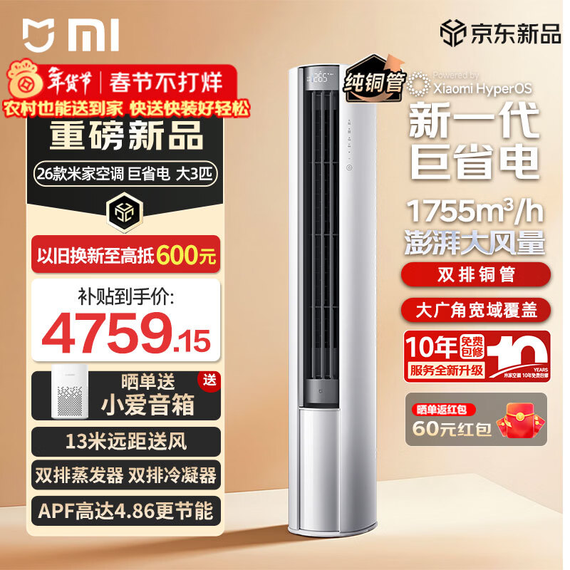 小米(MI)空调 大3匹 巨省电 大风口 双排铜管26款新一级能效空调柜机 整机十年质保米家72LW-PL30/N1A1(W) 巨省电 大3匹 新一级能效【2026年新款】