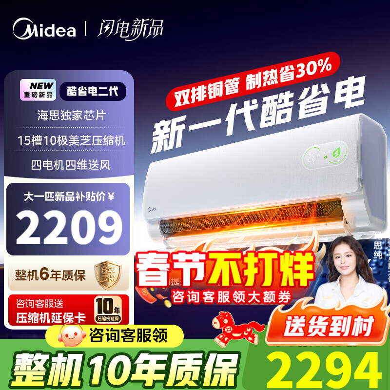 美的上门安装挂式空调酷省电二代新一级能效变频冷暖大1.5匹家用卧室挂机2匹空调防直吹节能省电大1P 酷省电二代 大1匹 【26年新品配置升级】