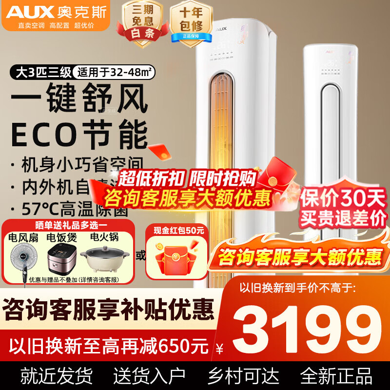 奥克斯(AUX)大2匹/大3匹空调柜机 新能效变频冷暖家用客厅圆柱立式空调以旧换新 大3匹三级能效【省电超值性价比】32-48㎡