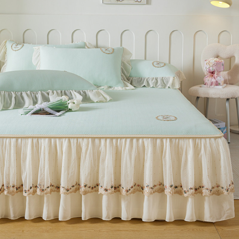 现货夏季冰丝凉席可水洗折叠单双人家用空调软席子带花边床裙款三