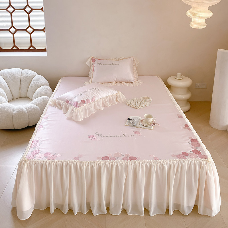 公主风夏季冰丝凉席三件可水洗少女心玫瑰刺绣床裙款空调软席