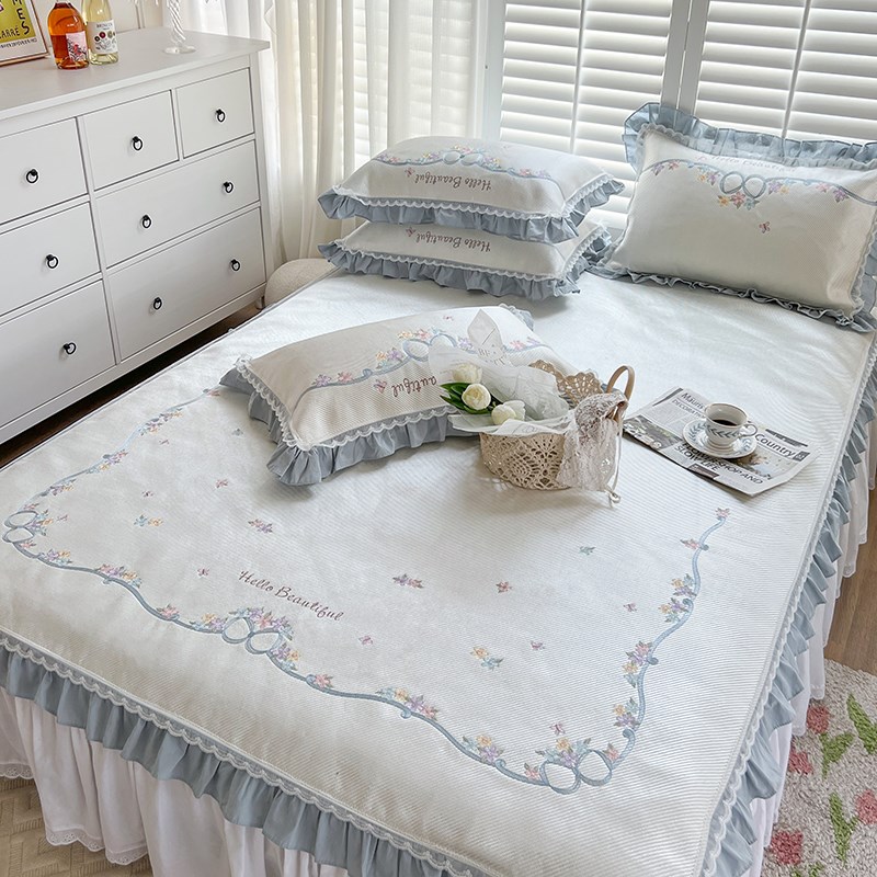 夏季公主风刺g绣空调冰丝凉席可机水洗蓝色小清新单双人凉感软席