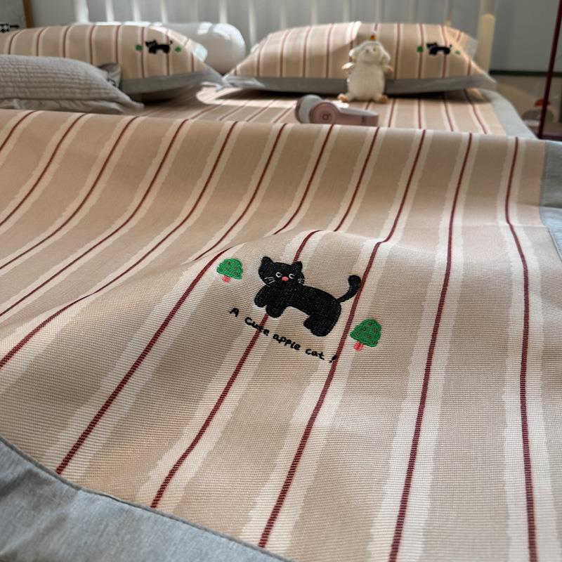 ins条纹猫咪夏季凉感可机洗冰丝凉席三件套空调软席子1.8m1.5米床