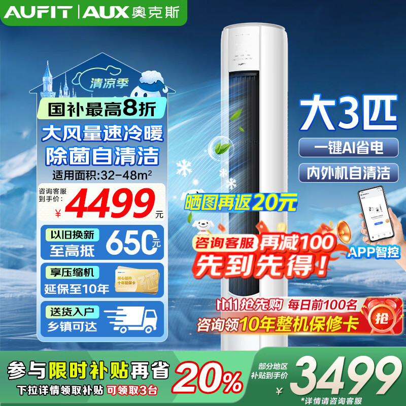 AUFIT空调奥克斯(AUX)出品大3匹柜机新一级变频冷暖自清洁家用客厅大标间大风量立柜式国补20%空调 3匹 一级能效 【25年新品】防直吹AFQA1(B1)