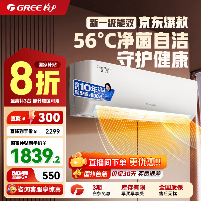 格力(GREE)天仪(云欢同款) 新一级 变频冷暖 56℃自清洁 家用节能壁挂式卧室空调挂机 以旧换新 家电国家补贴 大1匹 一级能效 天仪挂机 格力