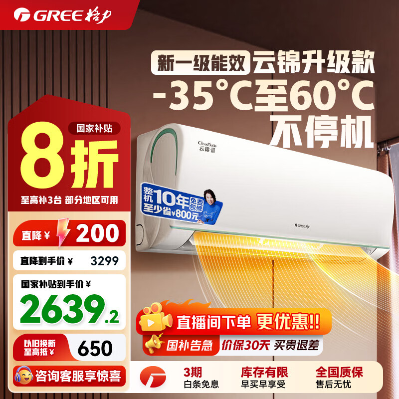 格力(GREE)空调挂机云锦三代/二代新一级能效变频冷暖 自清洁 WIFI壁挂式卧室空调挂机 家电国家补贴20%空调 1.5匹 一级能效 云锦三代新升级款