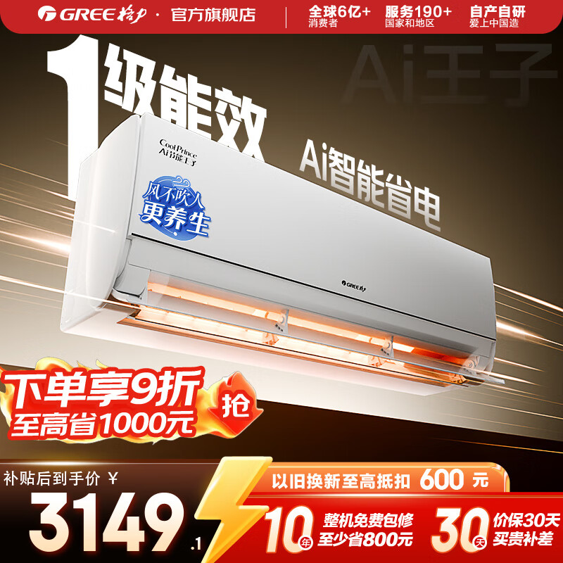 格力(GREE)空调 Ai节能王子 新1级能效 变频冷暖自清洁壁挂式卧室挂机 智能省电 风不吹人 国家补贴 以旧换新 1.5匹 一级能效 AI节能王子