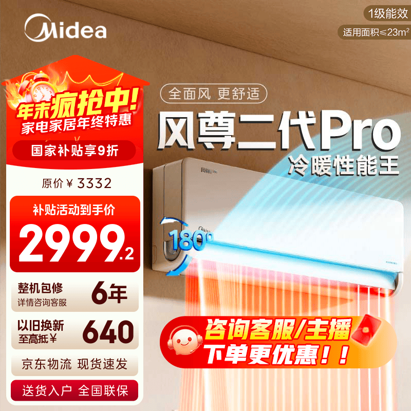 美的(Midea)空调挂机风尊二代Pro大1.5匹 新一级能效 变频节能冷暖两用壁挂式卧室空调防直吹APP智控 以旧换新 大1.5匹 一级能效 风尊二代Pro 冷暖性能王