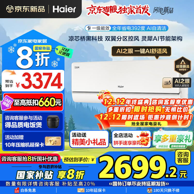 海尔空调麦浪舒适风1.5匹大1P强劲冷暖新一级能效节能变频家用挂机壁挂式双翼控风 AI之眼省电除菌除湿 1.5匹 一级能效舒适风+双翼分区控风+AI之眼