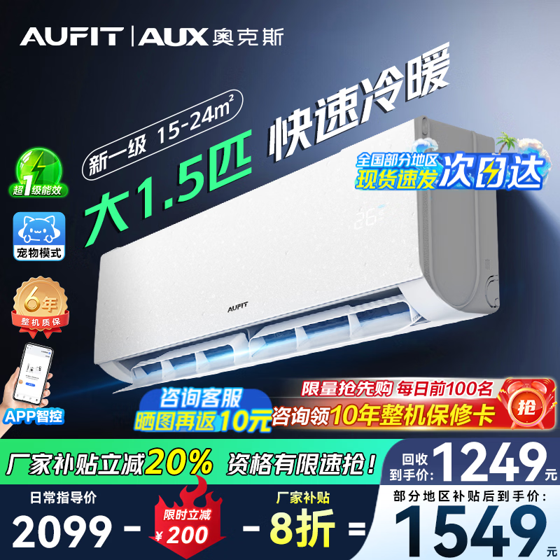 AUFIT空调奥克斯(AUX)出品大1.5匹挂机新一级能效变频冷暖自清洁家用卧室标间大风量省电国补20%空调 大1.5匹 一级能效 WIFI防直吹AFEA1(B1)