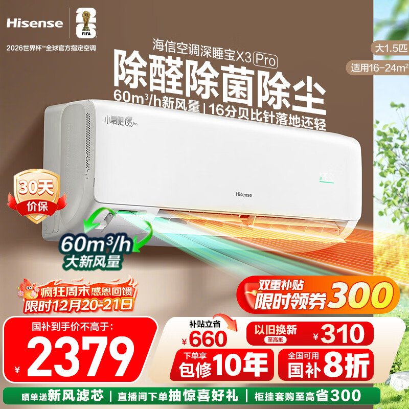 海信新风空调深睡宝X3Pro 大1.5匹 增氧新风 AI省电 双排铜管 1级能效挂机KFR-35GW/X300Pro-X1