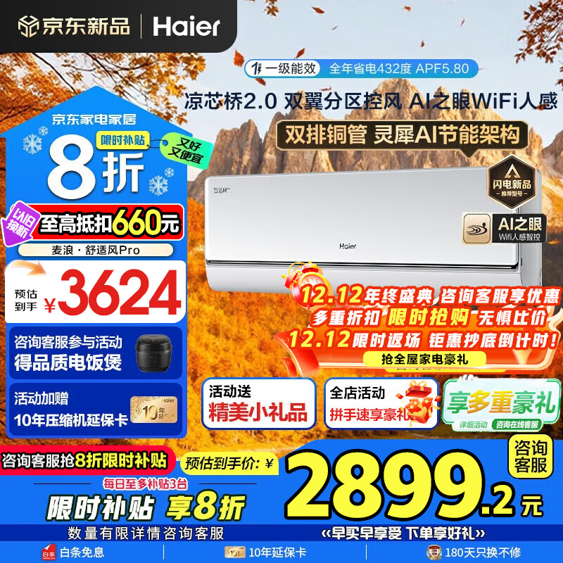 海尔空调麦浪舒适风Pro大1.5匹新一级能效节能变频家用壁挂式 声源定位送风 智慧除湿 双排铜管AI之眼 1.5匹 舒适风Pro+双排铜管蒸发器+双翼送风