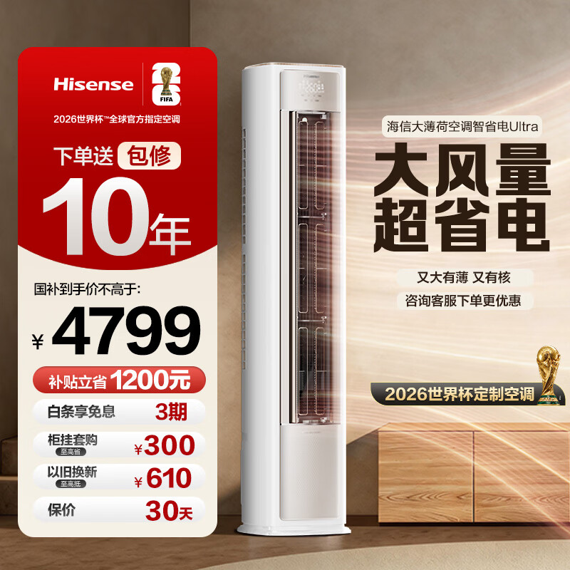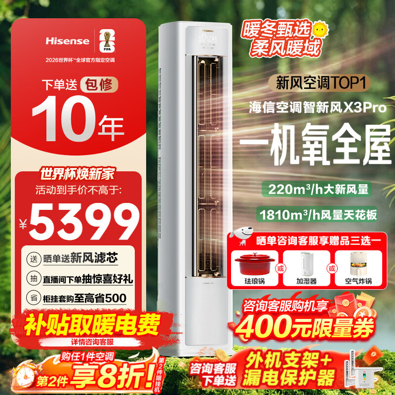 海信(Hisense)新风空调X3Pro 大3匹 增氧新风 AI省电 超大新风量 超一级能效 以旧换新 立式空调柜机 智新风 大3匹 一级能效72LW/X300Pro-X1