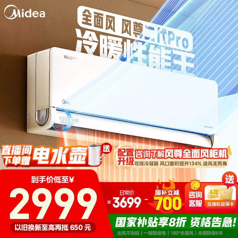 美的空调 风尊二代 超一级能效变频冷暖 智能舒适省电 家用空调挂机 以旧换新 家电国家补贴20% 风尊二代Pro 大1.5匹 双排外机制热