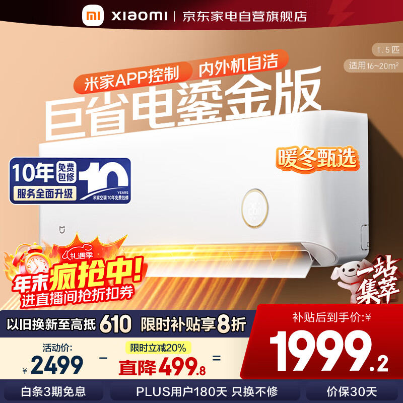 小米(MI)空调挂机1.5匹巨省电鎏金版新一级能效变频冷暖家用卧室节能智能空调壁挂式智能互联KFR-35GW/D2A1