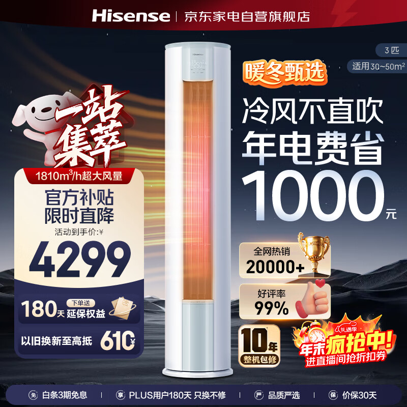 海信(Hisense)空调3匹柜机【25年新品】易省电 AI省电29% 冷暖 超一级能效 立式客厅空调柜机KFR-72LW/E290-X1A