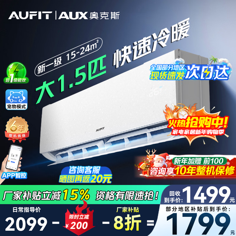 AUFIT空调奥克斯(AUX)出品大1.5匹挂机新一级能效变频冷暖自清洁家用卧室标间大风量省电防直吹空调 超省电 wifi智控+宠物模式+省电42% 1.5匹