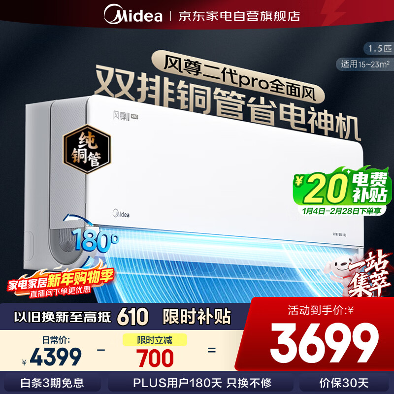 美的空调 风尊二代 超一级能效变频冷暖 智能舒适省电 家用空调挂机 以旧换新 家电补贴15% 风尊二代Pro 大1.5匹 双排外机制热