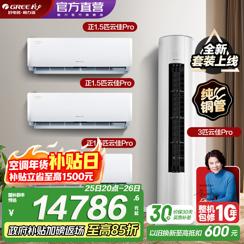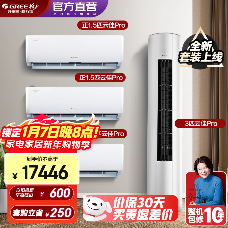 格力(GREE)空调套装 云佳Pro新款系列 智能WIFI 内外机双自洁 新一级能效挂机柜机组合套装 35云佳Pro*3+72云佳Pro 三室一厅