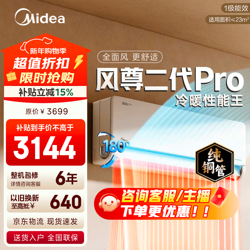 美的(Midea)空调挂机风尊二代Pro大1.5匹 新一级能效 变频节能冷暖两用壁挂式卧室空调防直吹APP智控 以旧换新 大1.5匹一级能效舒适防直吹 180°控风