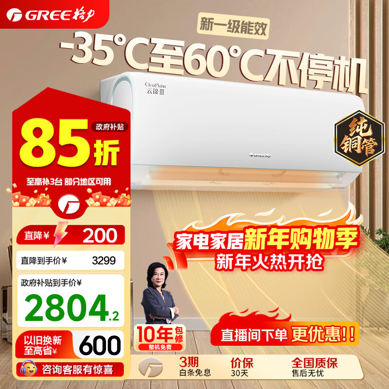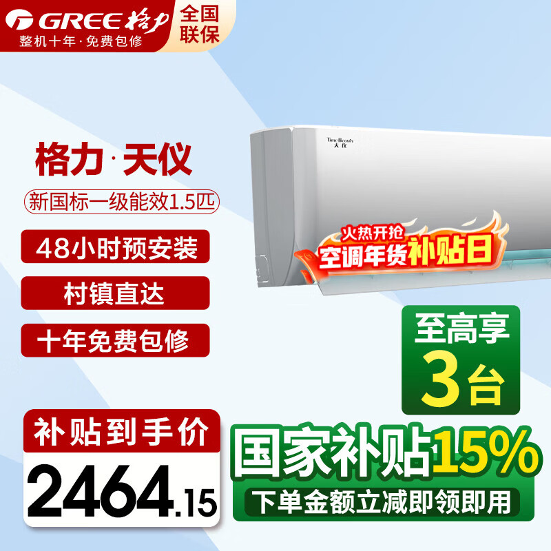 格力(GREE)空调1.5匹 天仪新一级能效 变频冷暖 56°C自清洁 卧室壁挂式空调挂机 1.5匹 一级能效 【天仪】新品上市
