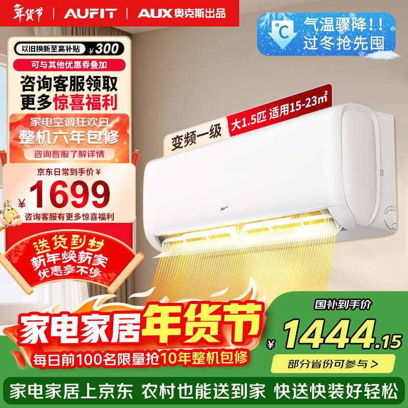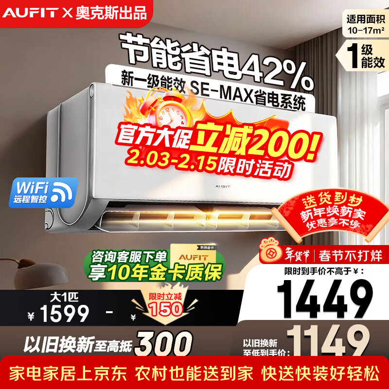 AUFIT空调奥克斯(AUX) 出品大1.5匹挂机新一级能效变频冷暖家用卧室壁挂式防止吹除菌自清洁以旧换新 大1匹 一级能效省电防直吹自清洁【手机智控款】