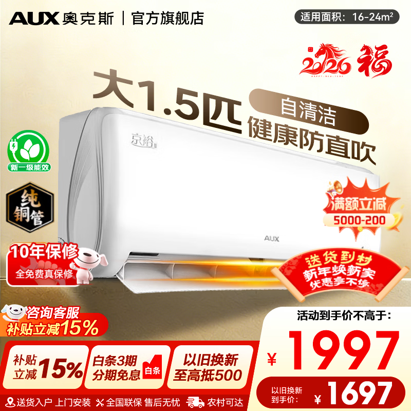 奥克斯空调1.5匹大挂机京裕新一级能效变频冷暖壁挂式客厅商居两用自清洁空间超省电以旧换新补贴 1.5匹 京裕 性价比款 店铺畅销