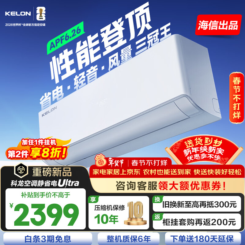 科龙(KELON)空调静省电QSUltra 咨询享低价 海信出品 大1.5匹挂机 双排满配 新一级能效 1050m³大风量 15分贝 大1.5匹 一级能效 【新品高配+双排紫铜管】