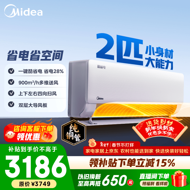 美的空调 2匹 酷省电 新一级能效变频冷暖 节能省电卧室空调挂机 壁挂式客厅 国家补贴 以旧换新 酷省电 2匹 省电28%