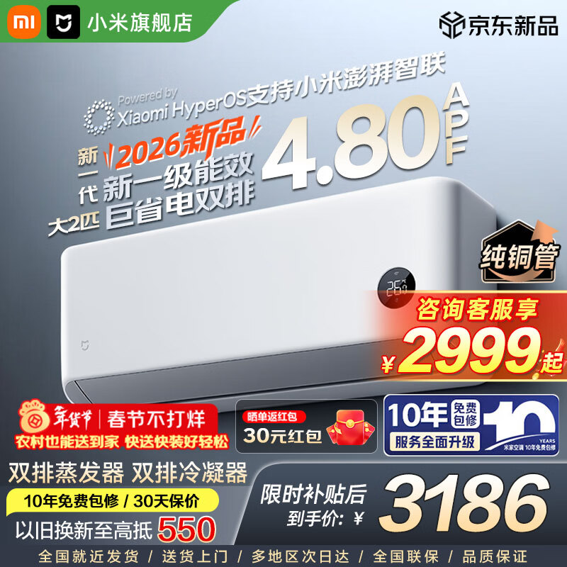 小米(MI)空调米家 大2匹【26款】巨省电双排款挂机 新一级能效 变频冷暖 壁挂式卧室挂机 50GW-PG20/N1A1 大2匹 新一级能效 巨省电挂机【2026新款】