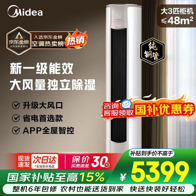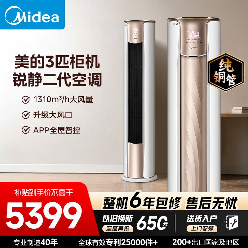 美的(Midea)空调锐静二代新一级能效全直流智能变频四代自清洁冷暖两用节能省电低噪空调立式柜机 3匹 一级能效锐静二代