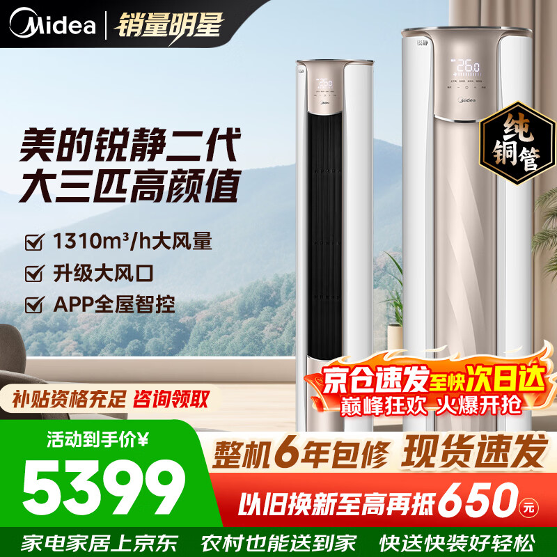 美的空调立式柜机 3匹锐静二代新一级能效变频节能 客厅圆柱形大风口智能自清洁快速冷暖 家电以旧换新 大3匹一级能效【大风口】锐静Ⅱ