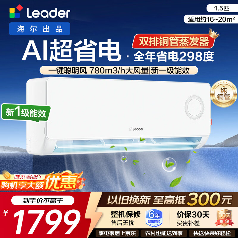 海尔(Haier)海尔空调出品统帅1.5匹/2匹大挂机新一级能效变频冷暖壁挂式空调Leαder 统帅 超省电 1.5匹 年综合省电298度/一键聪明风