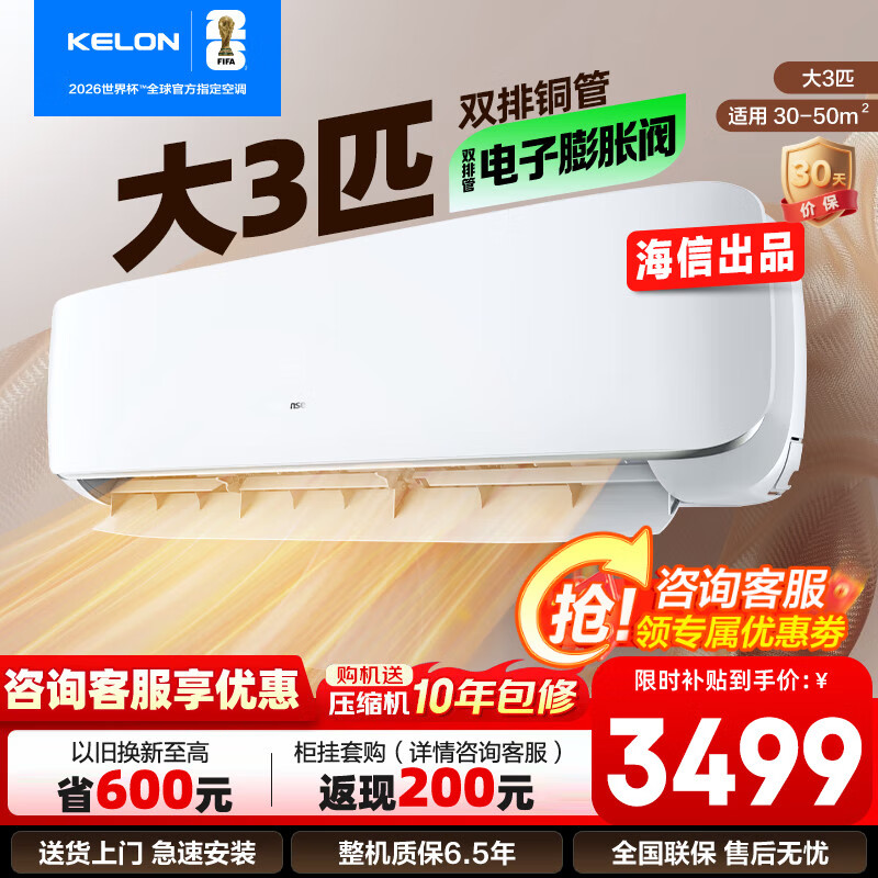 科龙(KELON)空调大3匹挂机 新一级能效 节能省电 大风量 变频舒适 急速冷暖 壁挂式客厅空调 以旧换新72QS 静省电 大3匹 一级能效72QS挂【问客服享底价】