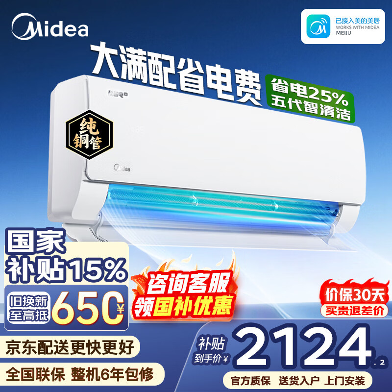 美的(Midea)空调大1.5匹挂机酷省电二代Pro新一级能效变频节能冷暖两用壁挂式卧室空调防直吹低噪WiFi智控补贴 酷省电 大1.5匹 全新升级 五代智清洁