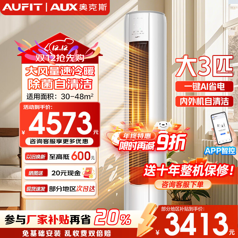 AUFIT空调奥克斯(AUX)出品大3匹柜机新一级变频冷暖自清洁家用客厅大标间大风量立柜式国补20%空调 3匹 一级能效【25年新品】防直吹AFQA1(B1)