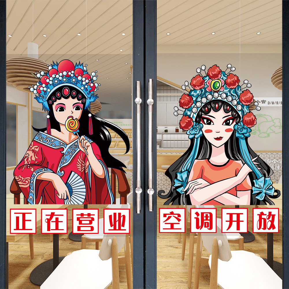 国潮风正在营业玻璃门贴纸面馆饭店蛋糕店鲜花店空调开放装饰海报