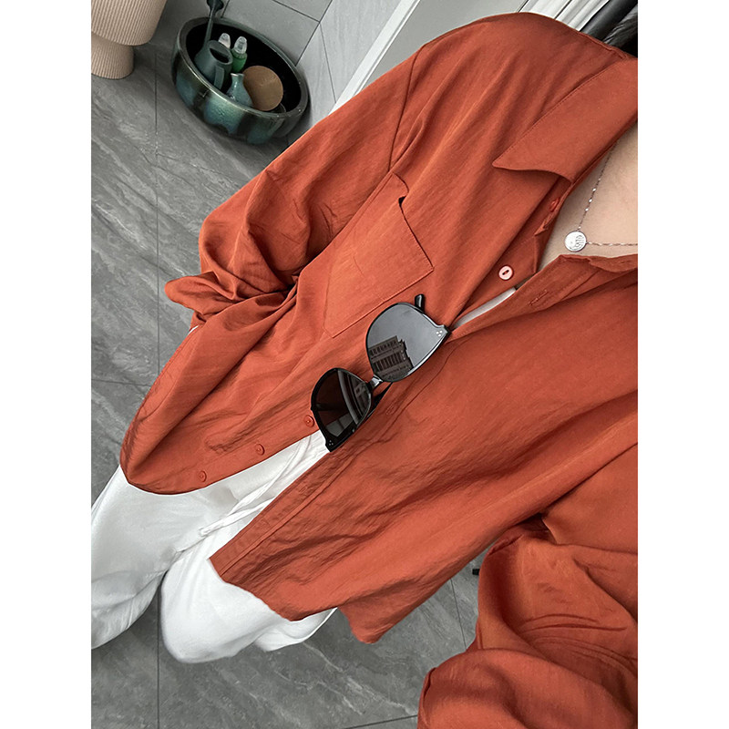 无D推荐!南瓜橘麻料翻领单排扣空调衫女早春新款高质量贴袋衬衫