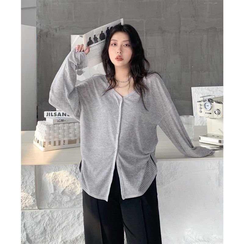 CV大码女装 秋新款V领坑条长袖衬衫空调小衫防晒开衫上衣显瘦胖mm