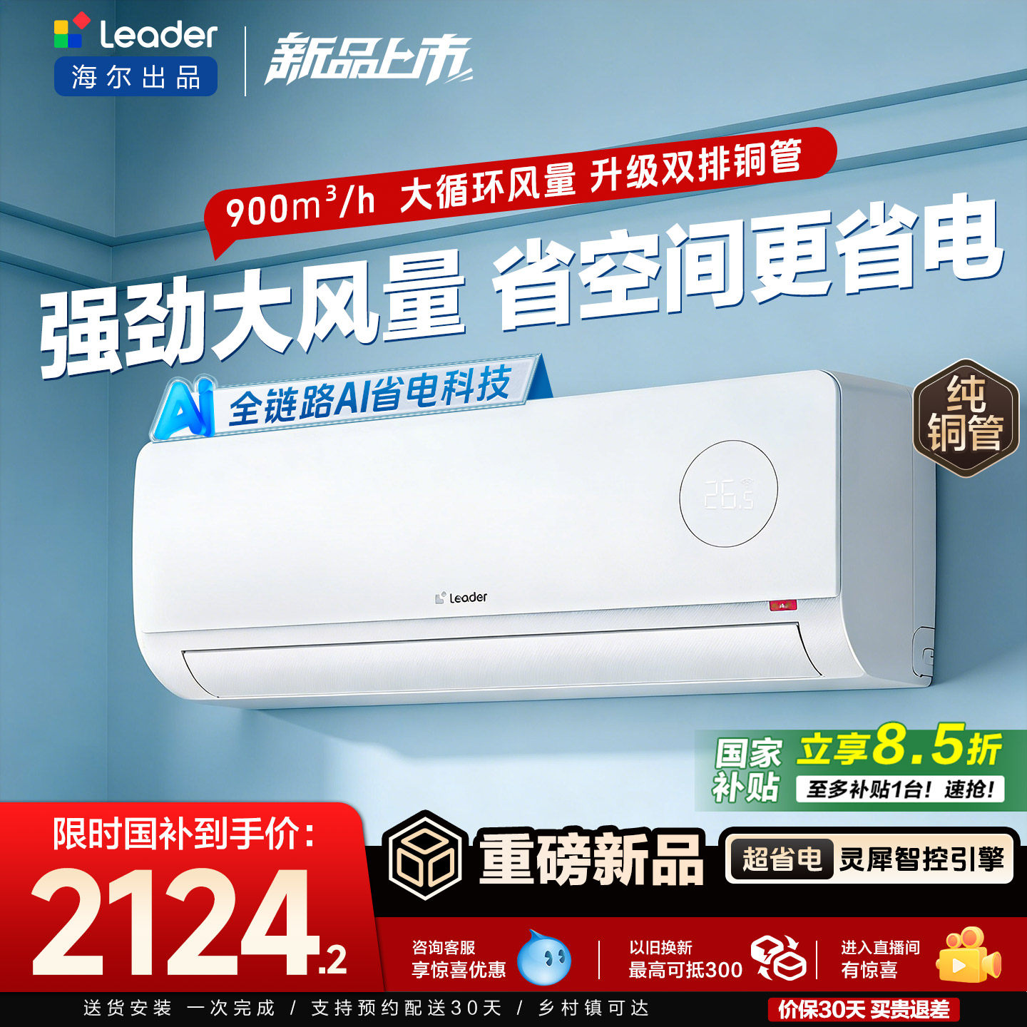 海尔空调雷神者2P/3匹P挂机一级能效变频冷暖两用客厅壁挂式省电