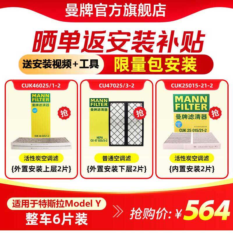 曼牌滤清器空调滤芯套装适配特斯拉MODEL Y内置外置滤芯HEPA