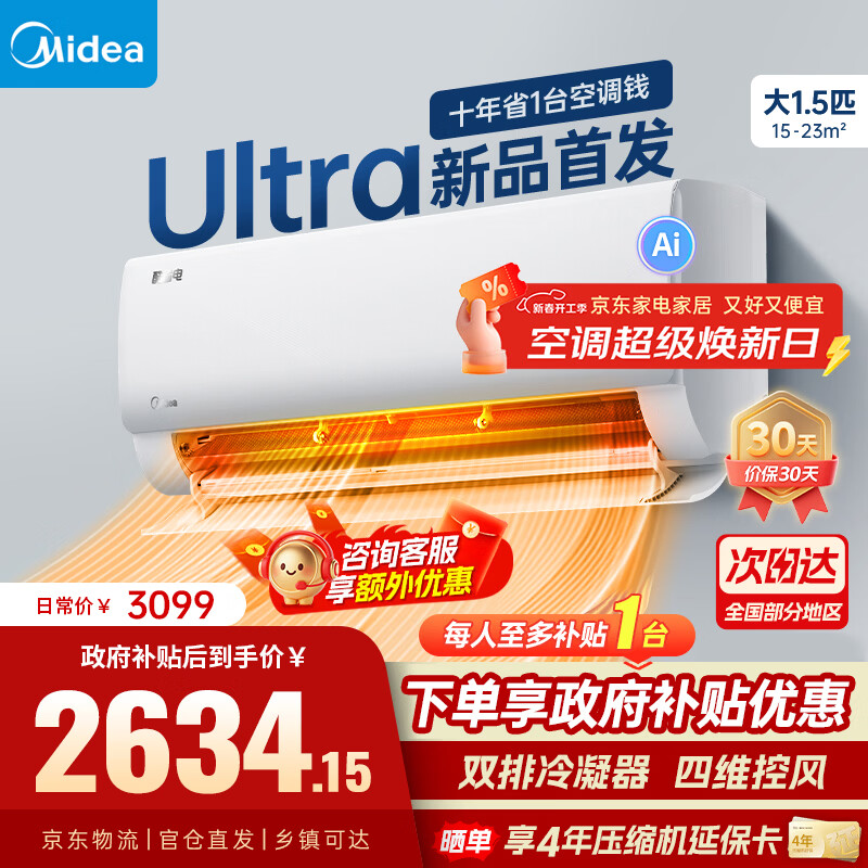 美的空调挂机 1.5匹酷省电二代 大1匹酷省电Pro 国家补贴15% 一级能效变频冷暖智能 以旧换新旗舰店 酷省电Ultra 1.5匹 【双排铜管】