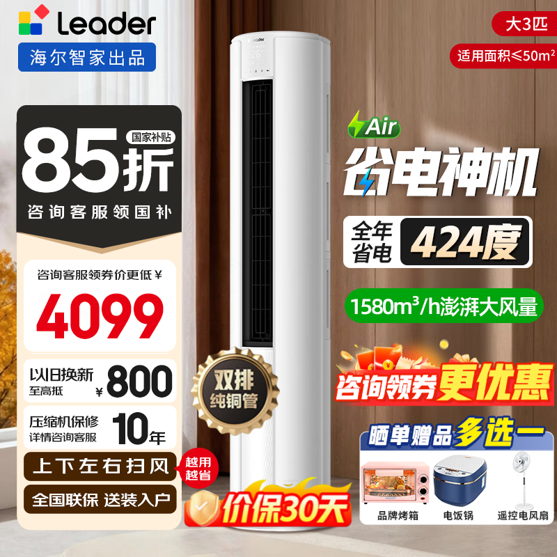 海尔(Haier)空调出品大3匹柜机 超省电 新一级能效 全直流变频冷暖大风口家用柜机客厅圆柱立式空调 大3匹 超省电Air 全年省电424度 一级能效